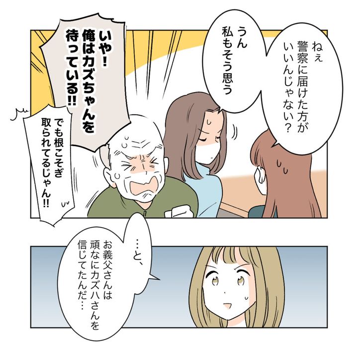 義父のことはスルーして、「ねぇ、警察に届けた方がいいんじゃない?」「うん私もそう思う」アケミさんとケイコさんが意見を一致させていると、「いや!俺はカズちゃんを待っている!!」義父が言い張るも、「でも根こそぎ取られてるじゃん!!」とバッサリ!