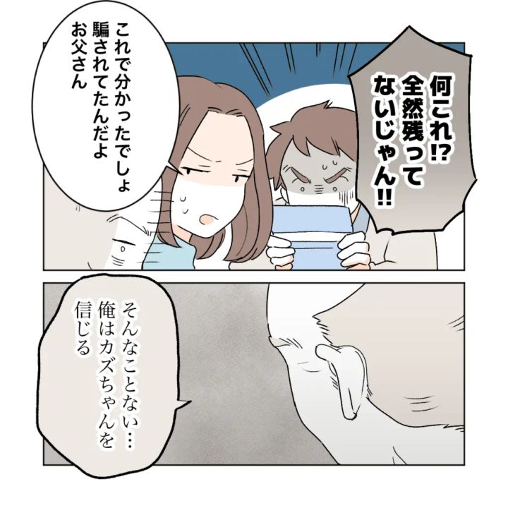 ここまで結果がハッキリ出ていてもカズハさんを信じたい義父。ほとんどお金を持っていかれてしまいましたが、カズハさんはこれだけで終わる気がしませんよね。