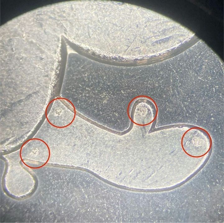 ミャクミャクの左手に印字されていたマイクロ文字は「オオサカ」。投稿者さんは30倍の実体顕微鏡で見つけたそうですが、30倍率でもとても小さいです。写真のように赤丸で囲まれていなければ、気づけなかったかもしれません…。