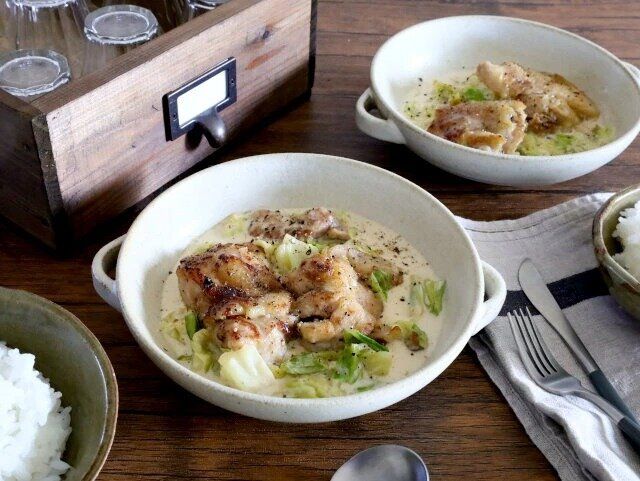 フリカッセは具材を炒めて、クリームを和えるようにさっと煮て作る、ホワイトシチューに似たフランスの家庭料理。柔らかく煮えた鶏肉とシャキッと食感のキャベツで、ご飯にもぴったり!