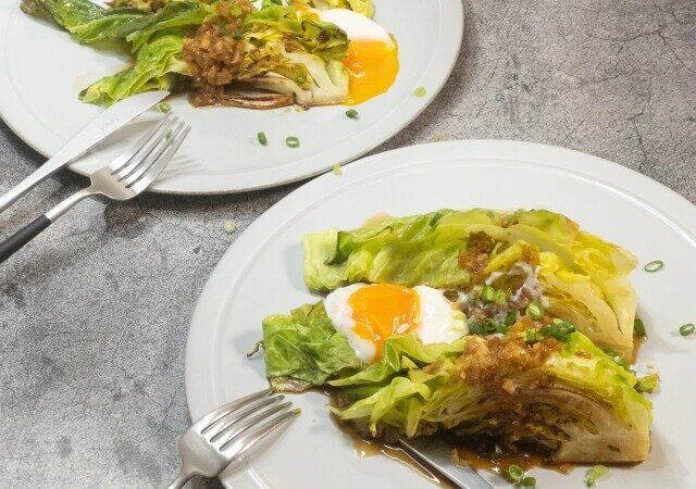 フライパンで焼いた春キャベツの上にソースをかけて、温泉卵を乗せるだけ、フライパン一つで完結するお手軽レシピです。キャベツに含まれるビタミンC、ビタミンUは、水に溶けやすいので、流れ出たビタミン類をソースにして春キャベツの栄養を丸ごと摂っちゃいましょう!
