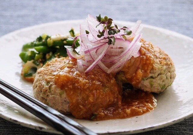 柔らかくて甘みのある春キャベツをたっぷり入れたハンバークはお肉少なめで、とってもヘルシー!おろしダレが白ごはんに合う一品です。
