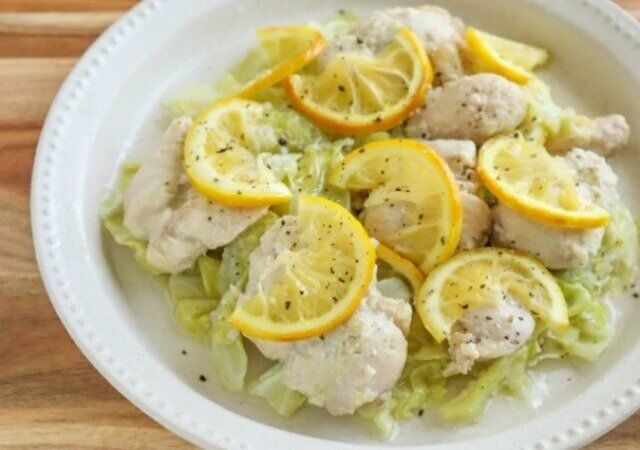 ③ 耐熱容器にキャベツを入れ、鶏肉をのせ、レモンを並べて、ふんわりとラップをしてレンジ600Wで5~8分程度加熱する。※鶏肉に火が通るまで加熱時間は調整してください。