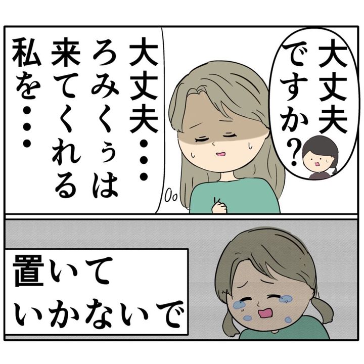 過呼吸になったジュリ実さんに気付いた女性が「大丈夫ですか?」と声をかけますが、ジュリ実さんは苦しそうにしたまま何も答えません。ジュリ実さんは「大丈夫・・ろみくぅは来てくれる。私を・・置いて行かないで」と思いながら、子どもの頃の辛かったことを思い出していました。