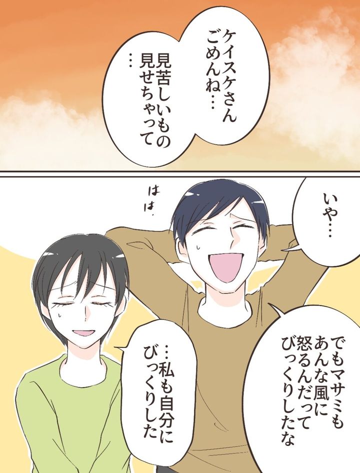 「ケイスケさんごめんね・・見苦しいもの見せちゃって・・」マサミさんがそう言うと、「いや・・でもマサミもあんな風に怒るんだってびっくりしたな。はは・・」ケイスケさん。「・・私も自分にびっくりした」とうつむきながら答えるマサミさん。