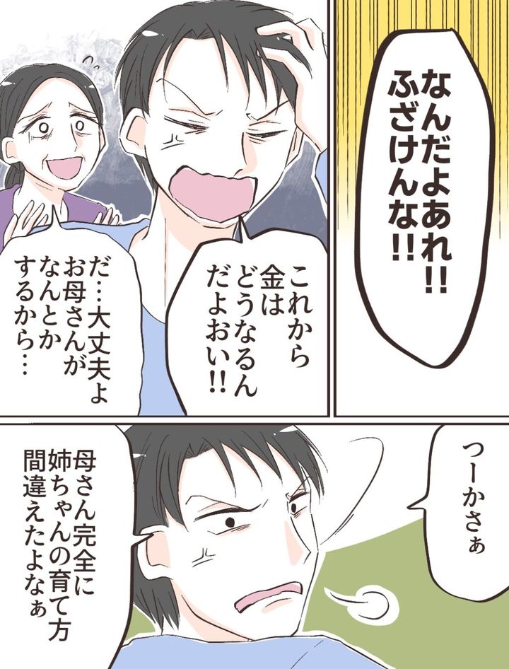 その頃マサミさんの実家では、「ふざけんな!!これから金はどうなるんだよ!」と怒鳴るカズキさんを何とかなだめようとするお母さんに、「完全に姉ちゃんの育て方間違えたよなぁ」と言うのを聞いていたカズキさんの奥さんが、「いや・・カズキ、バカなの??間違えて育てられたのはカズキだよ。そんな人だと思わなかった」と呆れ、「色々考えたいから・・ちょっと無理だわ」そう言い捨てて出て行ってしまいました。