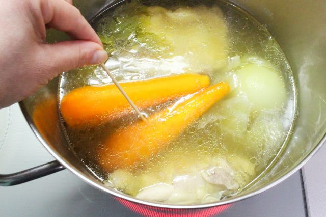 にんじんや大根など硬い野菜に竹串を刺して、火の通りを確認。にんじんを丸ごと1本煮込みましたが、竹串がスッと入るくらいにやわらかく煮えていました。