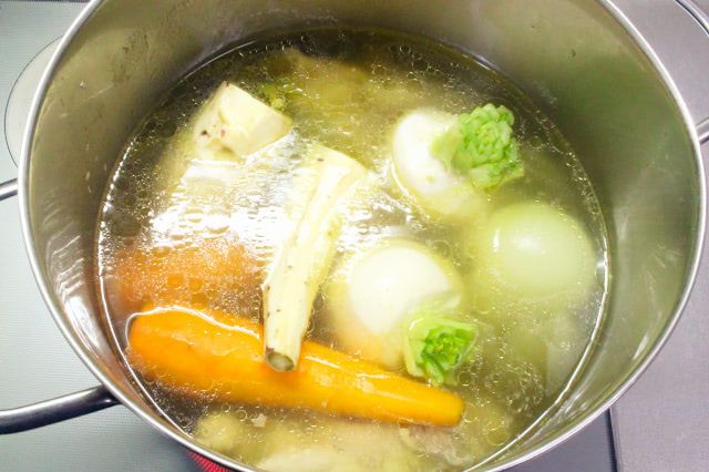 野菜を加えると温度が下がるので、強火にして一旦沸騰させます。野菜のアクはそれほど味に影響しないので、お好みで取り除いてくださいね。