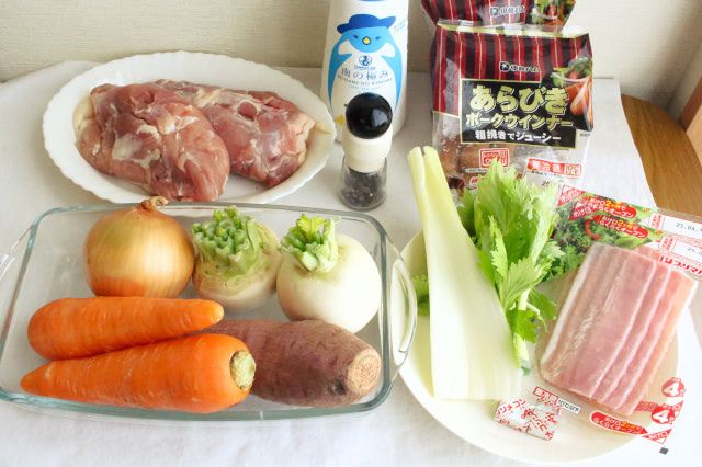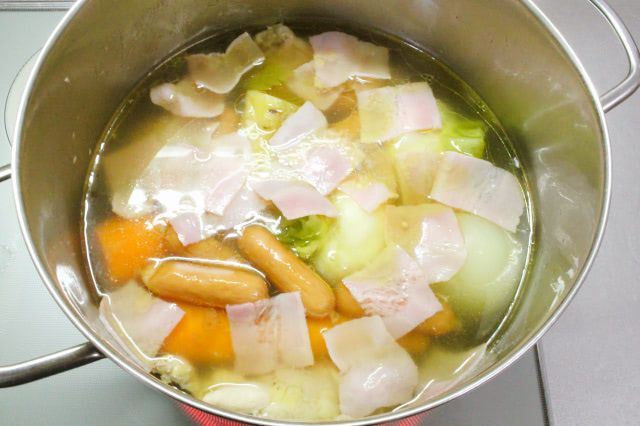 6. 食べやすい大きさに切ったベーコンとソーセージを加えてフタをし、さつまいもとかぶがやわらかくなるまで煮込みます。最後に味見して、塩やコンソメで味を調えます。