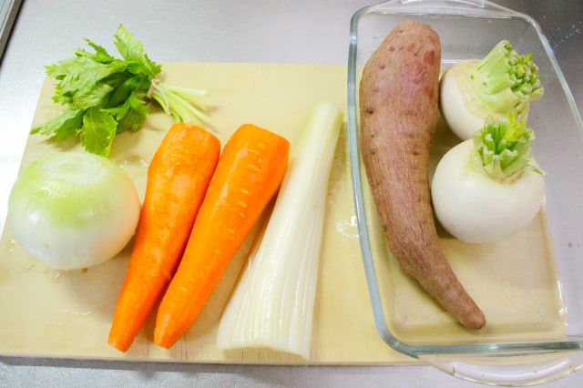 火の通りやすいじゃがいも、さつまいも、かぼちゃ、かぶなどは、にんじんがやわらかくなってから加えます。この段階では、皮を剥かずに置いておきましょう。