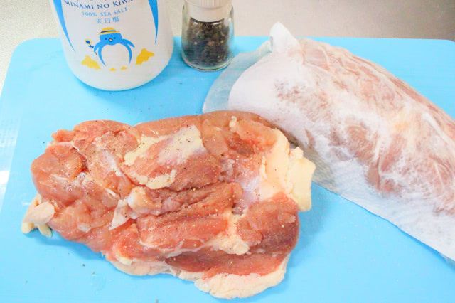 1. キッチンペーパーでお肉の水分を拭き取り、しっかりめに塩を振って揉み込みます。