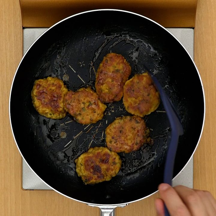 3.フライパンにサラダ油を入れ、たねを1/6量ずつ丸くしぼって形をととのえる。中火で熱し、表面に焼き色がつくまで2〜3分ほど焼く。上下を返して3分ほど焼き、★を加えてとろみがつくまで煮からめる。