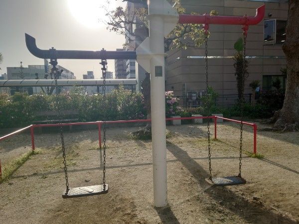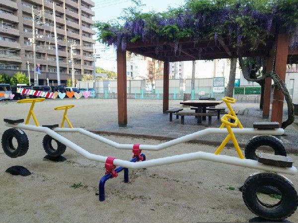 シーソー、上下に動く昔ながらの遊具。下にタイヤがついています。