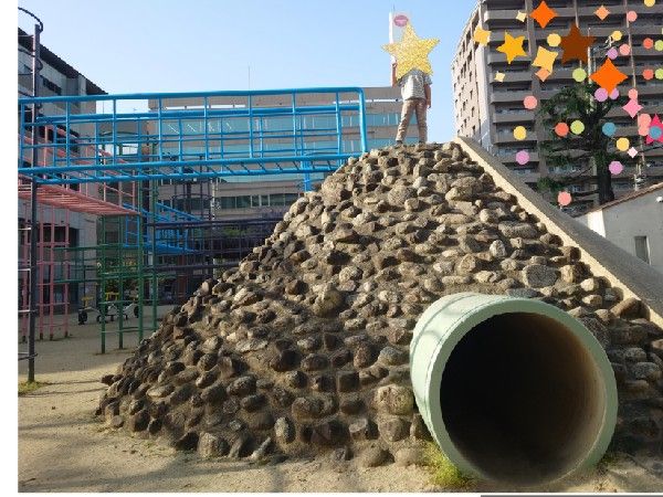 この複合遊具!小さいお子様には少し難易度が高いので親御さんは落ちないよう下についたり見守りが必要かもしれません。小学生もどんどん登ったり降りたり滑ったり!公園遊びは汚れても良い服で行っているので汚れも気になりません。タイヤや石を使ってどんどん上に登る遊具!落ちないよう気をつけて滑り降ります!
