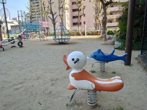 バネが下についていて前後左右、動かして遊ぶ遊具。いよてつ髙島屋の観覧車「くるりん」も見えますよ。ゆらゆら揺られて楽しく遊びます。なんだかレトロかわいいアヒルとイルカです!