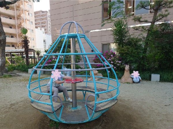 ぐるぐる回転する遊具。回しすぎるとスピードが出るのでほどほどに回転スピードに気をつけて!形がなんか、かわいいです!