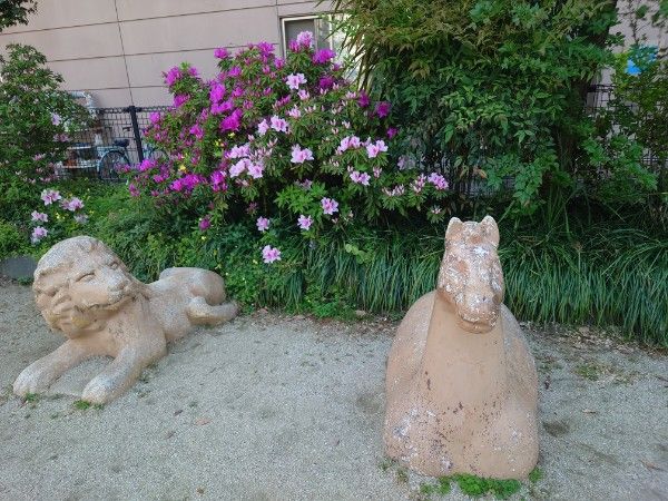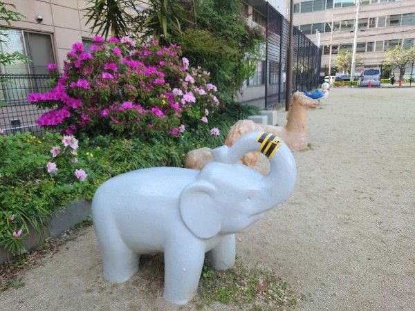 ぞう、ライオン、馬のオブジェがあり背中に乗ってポージングしてました。