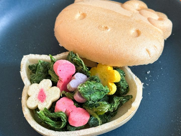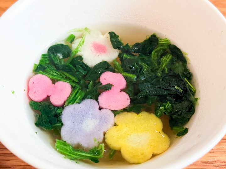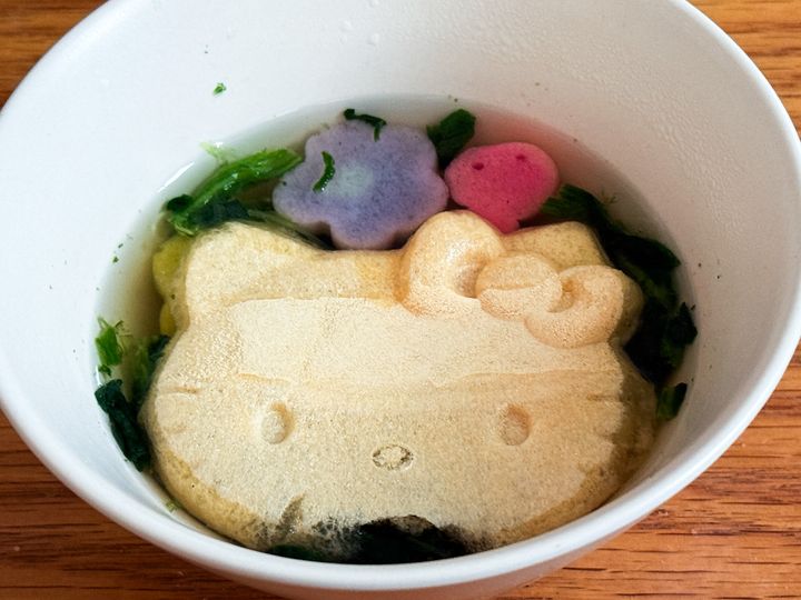 さて、実際に「ハローキティ 宝の麩」を食べてみました。今回は「おすまし」をチョイス。お湯を注ぐと、ふやきがふんわりとほどけ、中から色とりどりの具材が現れます。