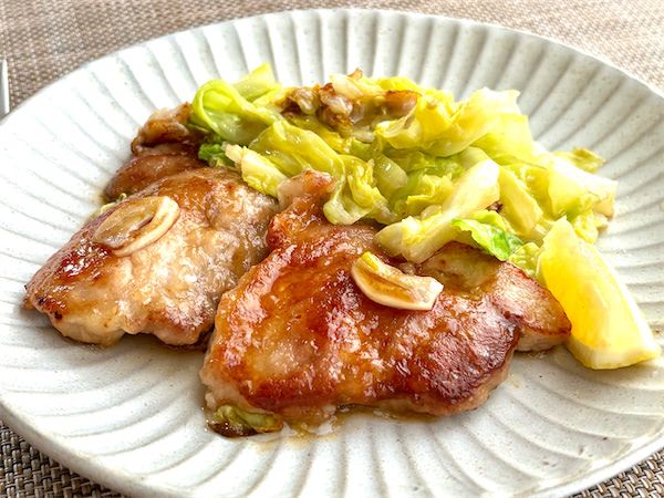 あ、すごくおいしい。この料理、大好きです。豚肉はやわらかく、春キャベツは甘くてやわらかくおいしいたれが絡んで無限に食べたいくらいです。調味料が淡口しょうゆだけなのに、オリーブオイルのコクと肉やキャベツの旨味が合わさり、味わい深いたれになっています。添えのレモンは途中まではかけずに、まずはそのまま味わってから、途中で味変のようにしてさっぱりとさせると2度楽しめるかなと思いました。
