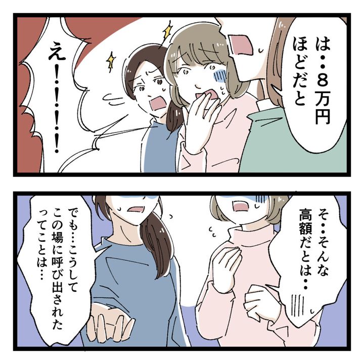 「は・・8万円ほどだと」お母さんが答えると、「え!!!!」と2人の保護者が「そ・・そんな高額だとは・・」「でも・・こうして、この場に呼び出されたってことは・・」と驚いて、