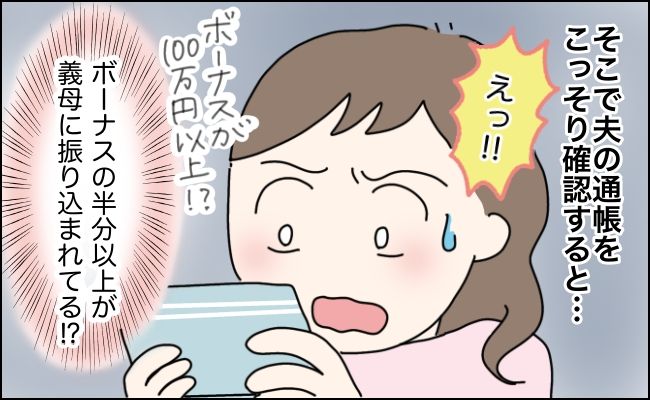 よくよく通帳を見てみると、ボーナスのうち、私たちの生活費口座に振り込まれた金額以外は、別の口座へまるまる振り込まれているとわかりました。その振込先はなんと義母の口座! 夫はボーナスの半分以上の金額を義母に渡していたのです。驚いた私は、その夜夫に話をしてみました。