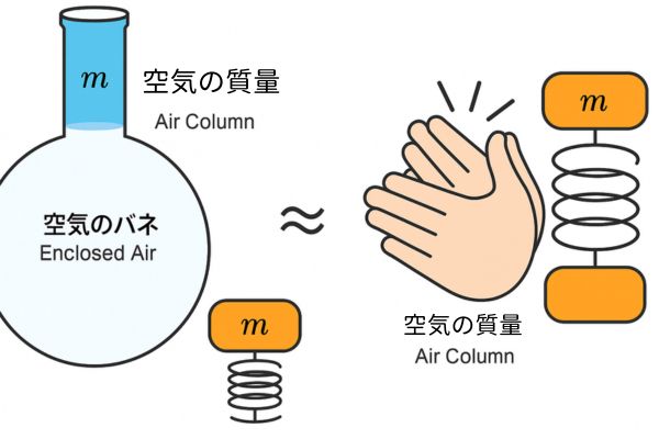 つまり、瓶の口に息を吹きかけるときと、拍手をするときとでは、どちらも「空間に閉じ込められた空気」が「狭い出口を通して振動し、特定の周波数で共鳴する」という共通の構造があるのです。
