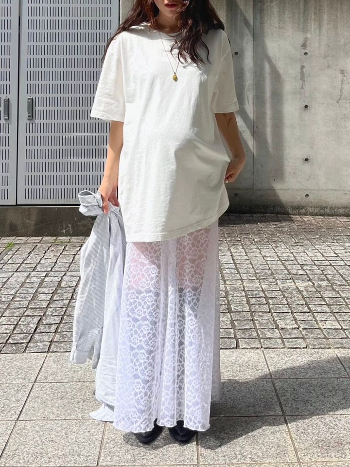 「妊娠後期になるとはけるボトムが少なくて。ストレッチ性の高いこのドレスは、お腹まわりも窮屈でなく色違いが欲しいくらい愛用中で、UNIQLOのメンズTシャツの、XXLサイズを上にレイヤード。白いフローラル柄レースのギャップが可愛いなと。かなり大きいTシャツなのでミニドレスとして1枚で着てもいいんですが、それだとビーチやプールサイドみたいだし、もう少しおしゃれに盛り上げたいと思ってこのコーデにしました。足元はあえてロングブーツを合わせて肌の露出を抑えたほうが、レースのロマンティックさが引き立つ気がします」