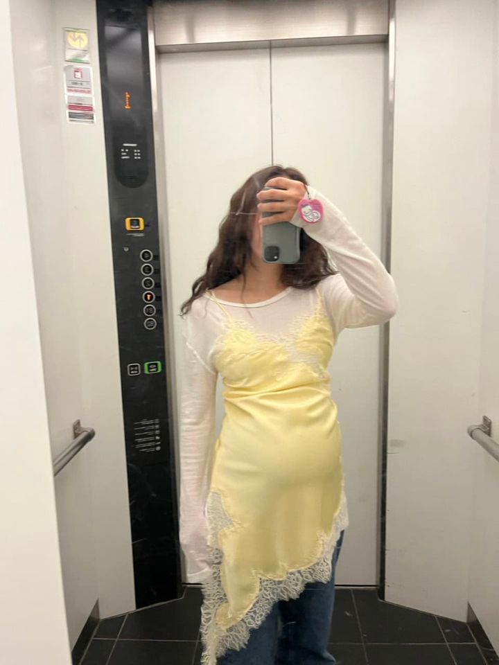 2025年春夏のビッグトレンドアイテムといえば、密かに楽しむものであったランジェリーを使ったコーディネート。これこそマタニティ期に取り入れるのは難しいのでは? と思っていたのですが、伊東さんの手にかかればそんな心配は無用。
