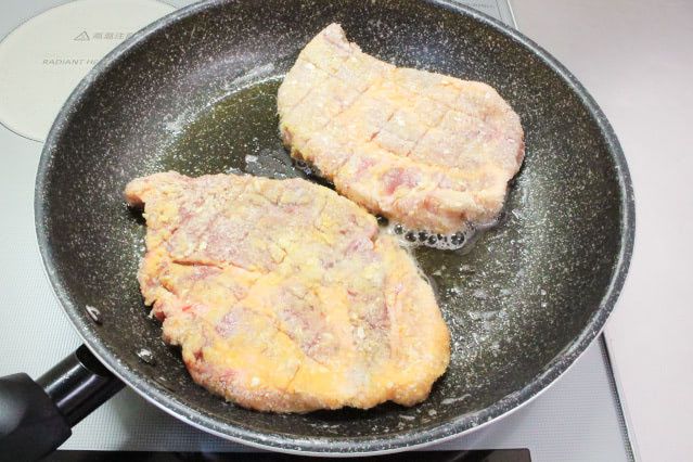 130℃くらいの低めの温度でじっくりと揚げ焼きにします。油の量がとても少なく、揚げ焼きというよりも焼いている感覚。バターの香りも広がって、とんかつではなく、ポークソテーを作っている気分。