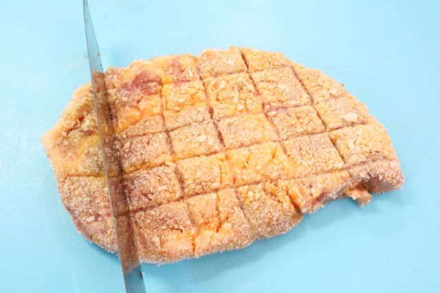 4. 衣付けした豚肉に包丁の背で網目模様を付けます。