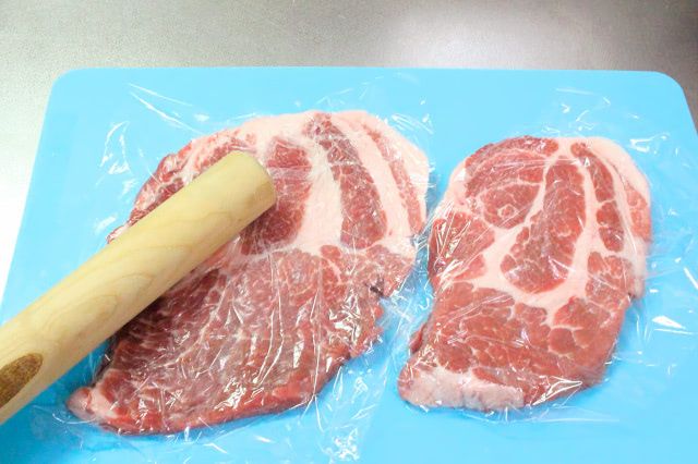 肉叩きが無い場合は、豚肉にラップを被せて鍋の底や麺棒で叩いて薄くしてくださいね。