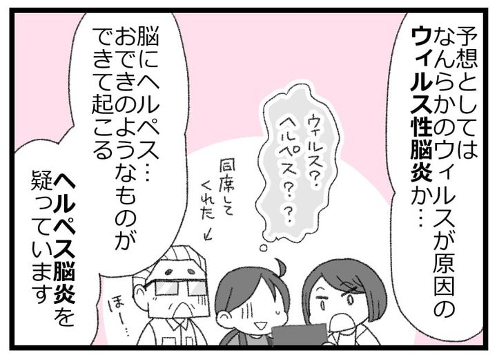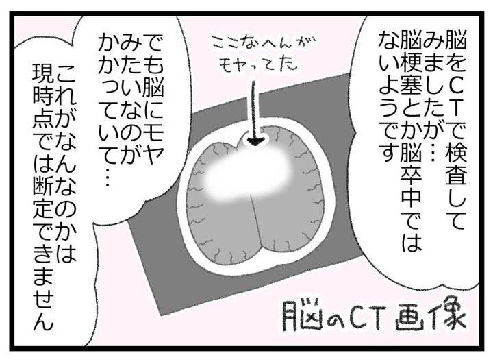 搬送された時点では症状が断定できなかったそうです。出血は確認されなかったため、脳梗塞や脳卒中ではないことが分かったものの、脳に何かしらの異常が起こっていると分かり、エェコさんは思考停止してしまうのでした…。