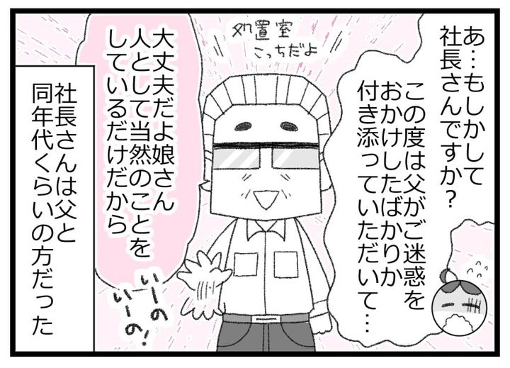そして2時間後、ようやく病院へ到着したエェコさん。病院でお父さんの職場の社長さんを見つけました。