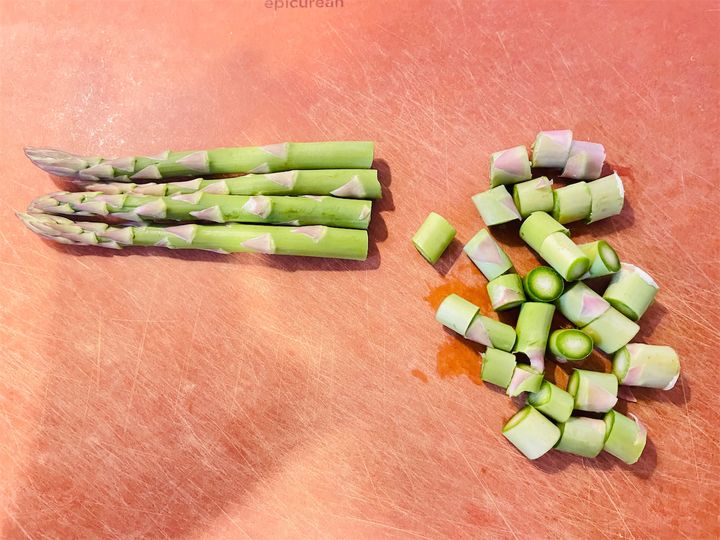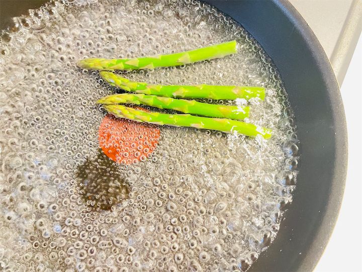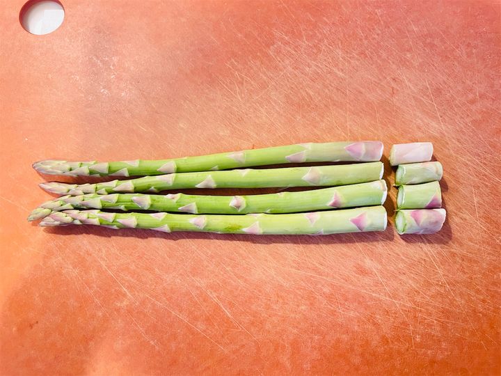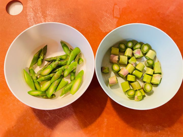 1.アスパラガスは根元を1~2cm切り落とし、手で曲げて折る。硬い根元の方は小口切りにし、穂先の方は固めに茹でて斜め切りにし、軽く塩をふる。