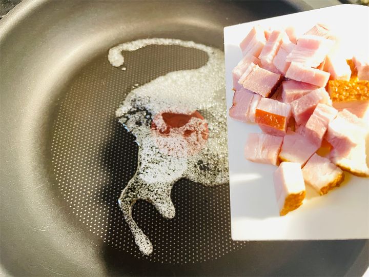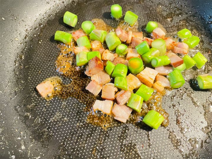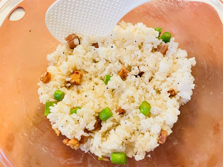 2.1の小口切りにしたアスパラガスと刻んだベーコンをバターで炒めたら[A]を加えて塩・粗びき黒こしょうで味を調え、温かいご飯に混ぜ込む。