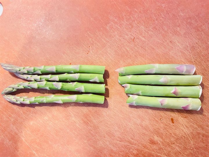 アスパラを手でしならせるとポキっと折れるのでそこが境目です。