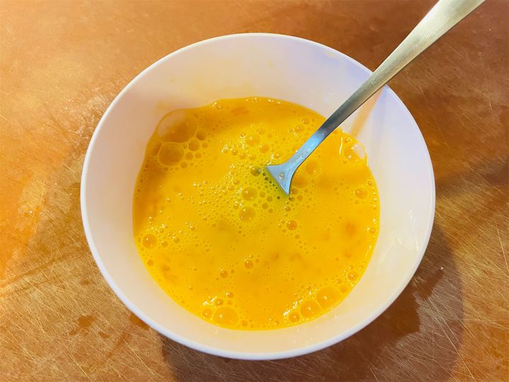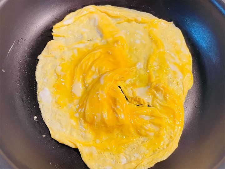 3.2のフライパンを拭いてサラダ油(適量・分量外)を熱し、軽く塩をした溶き卵を入れ、大きくかき混ぜながら半熟状にする。