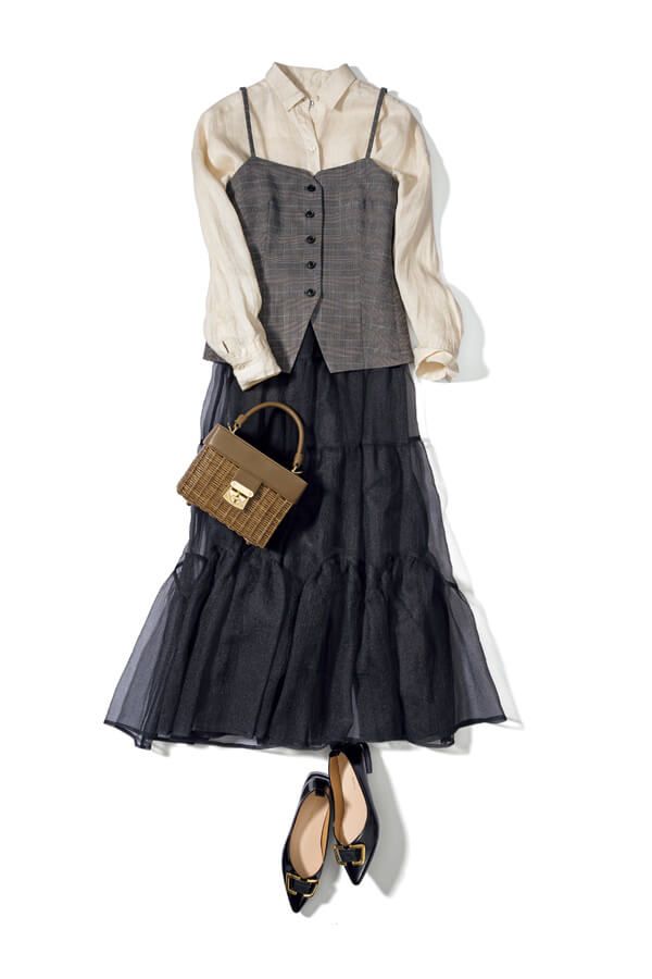 ベージュシャツ¥20,900/マイカ アンド ディール(マイカ アンド ディール 恵比寿店) ビスチェ¥17,600/ストラ スカート¥13,970/RANDA バッグ¥30,250/ダイアナ(ダイアナ 銀座本店) 靴¥7,700/オリエンタルトラフィック(ダブルエー)