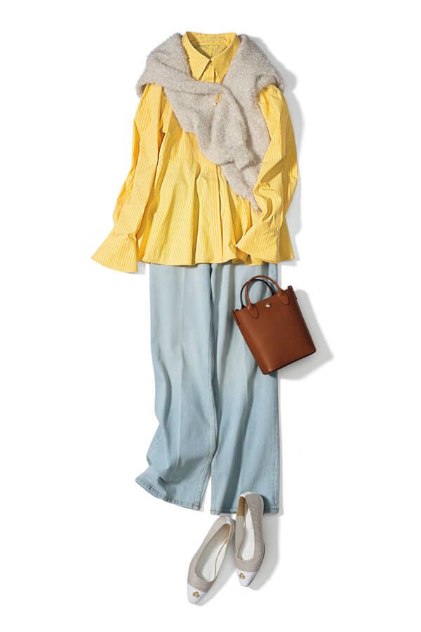 イエローシャツ¥5,489/VIS 肩にかけたニット¥8,690/31 Sons de mode(ヒロタ) パンツ¥13,000/PLST ブローチ¥7,700/アビステ バッグ¥79,200/ロンシャン(ロンシャン・ジャパン) 靴¥17,600/ダイアナ(ダイアナ 銀座本店)