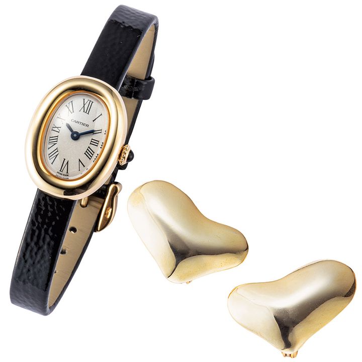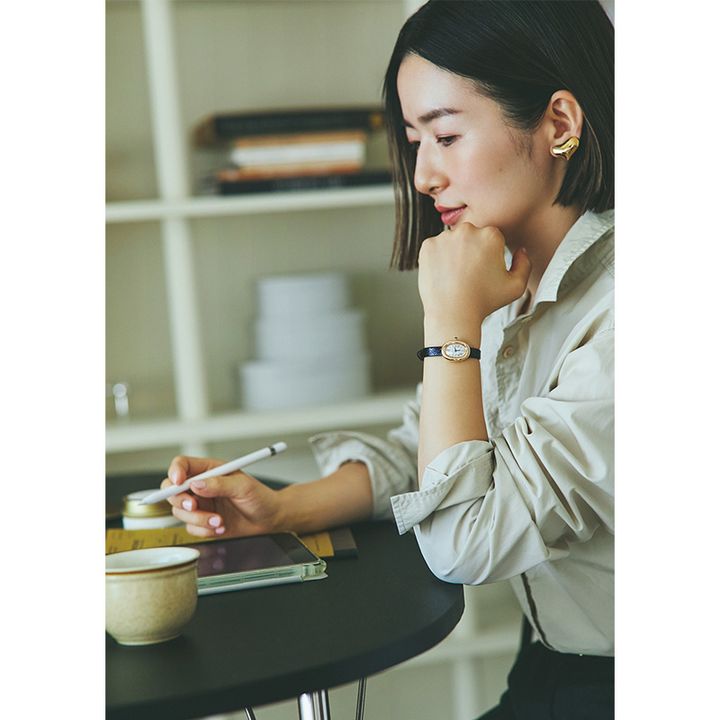 「アクセは品よく見えるゴールド派。登園前の朝がどんなにバタバタでも絶対に着けるのが存在感あるイヤリング。薄いメイクでもバランサーになってくれます。手元はカルティエのベニュワール。元々自分でプッシュギフトにするつもりでしたが、夫がプレゼントしてくれました」