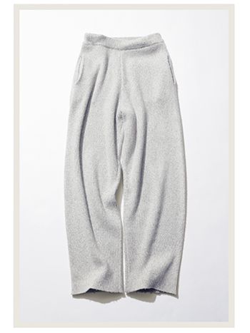 さりげなくすぼまったテーパード型&フラットなウエスト部分で、街でも浮かない脱力感へ。適度に重みの出るウール混の生地に加えて、リブの陰影により体の凹凸も目立ちにくい1本。ヒールもスニーカーも合う広すぎないすそ幅も魅力。
