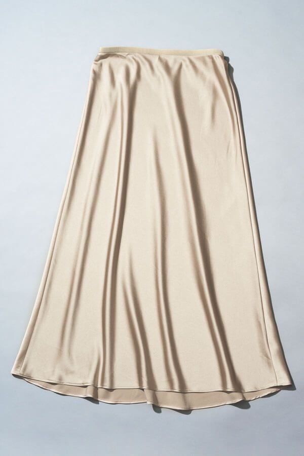 「ツヤ感あるナロースカートはリッチ見えが叶います。ワントーンコーデにするのがおすすめ」