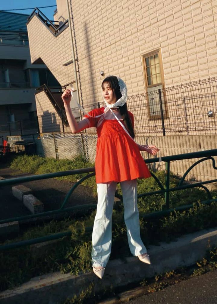赤Tシャツ 5,995円、赤キャミソールチュニック 6,490円/ともにフリークスストア(フリークスストア渋谷)花柄デニムパンツ19,800円/The Girls Society 頭に巻いたつけえり 13,200円/arth(OVERRIDE 神宮前)ミュール 7,900円/チャールズ&キース(チャールズ&キース ジャパン)