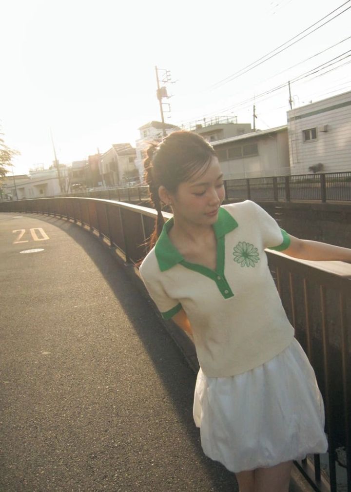 アイボリー×グリーンニット15,950円/Mardi Mercredi(MARDI MERCREDI JAPAN)白バルーンミニスカート 12,010円/マーガリン フィンガーズ(HANAKOREA)イヤリング2,200円/GOLDY
