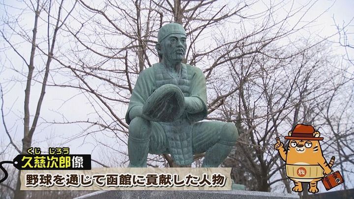 こちらは函館市内にある、“久慈次郎”という人気を博した野球選手の銅像。