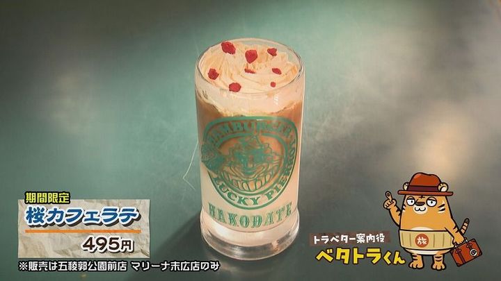 そんなラッキーピエロでは、この春限定で生クリームと桜のチップが乗ったカフェラテが登場中だぞ~!