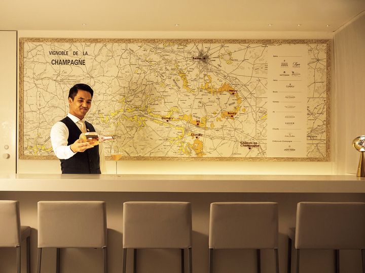 ラウンジ&バーの壁にはシャンパーニュ地方の地図。公認の11のメゾンの生産者が来日する機会も設け、イベントも随時開催する