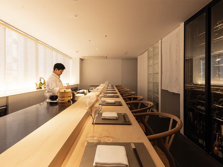 料理長の安部愛弓さんは、魚の香りを大切に、風味がシャンパンによってより開くことを意識して握りを考案。鮨店にして200種超のボトルがある。ディナーコース¥26,400~