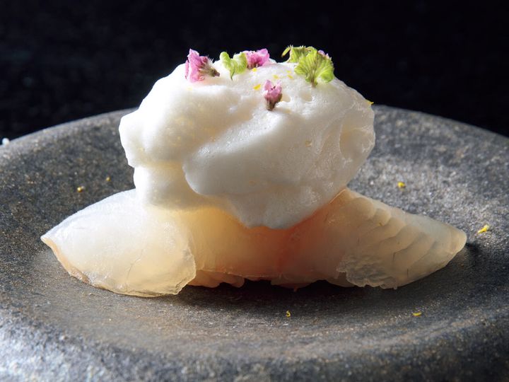 日本酒で作る万能調味料の煎り酒にヒントを得て、シャンパンを煮詰め作った泡をのせた京都産ヒラメ。柚子と穂紫蘇の香りがアクセント