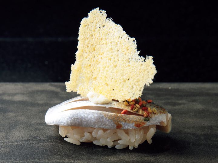 和歌山の小肌。しっかり締めてシャンパンの酸と合わせつつ、華やかさともつり合うように焼いたグリュイエールチーズをのせている